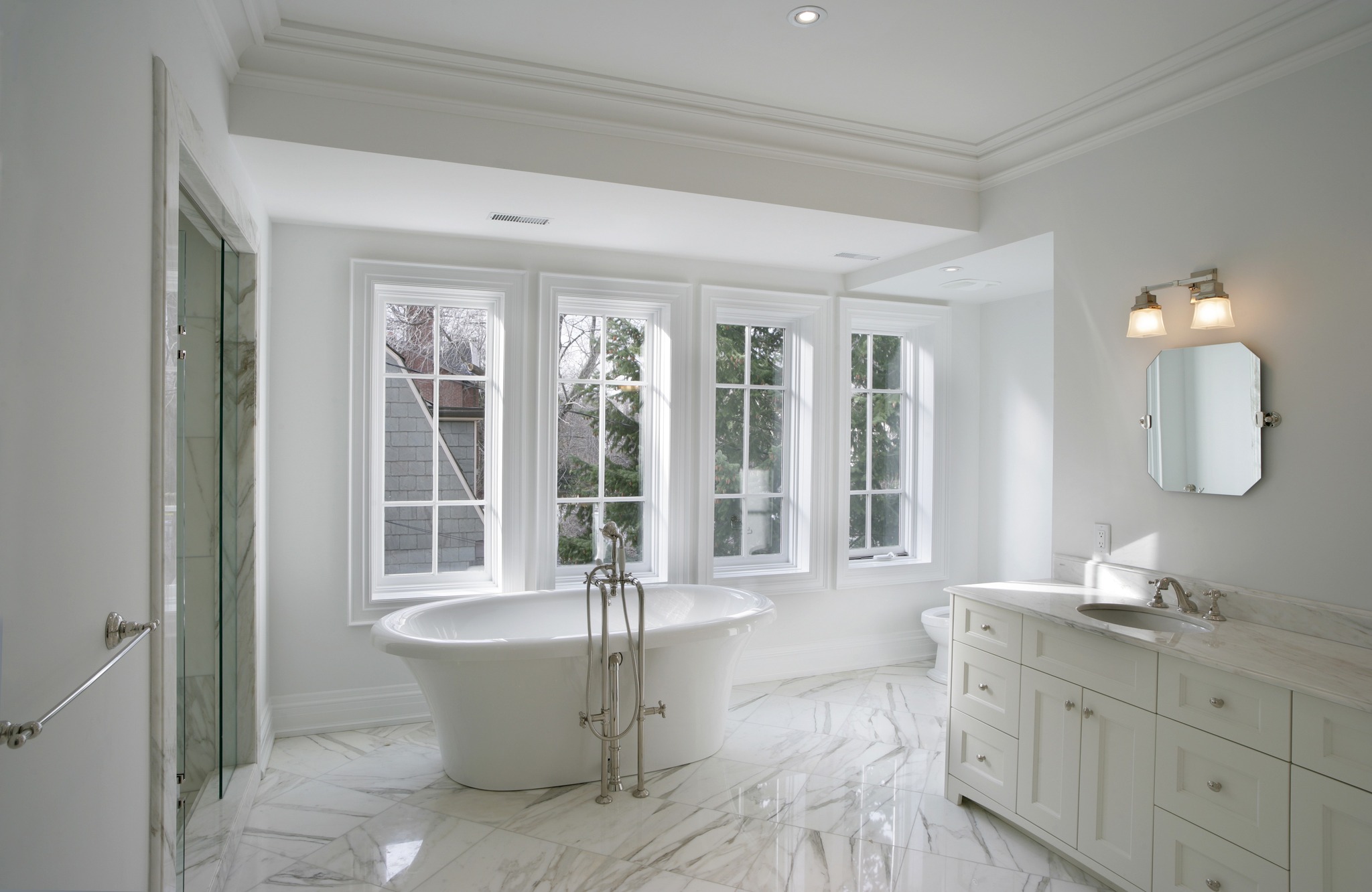 Modern, luxurious bathroom renovations including showers, vanities, lighting, and tilework.
